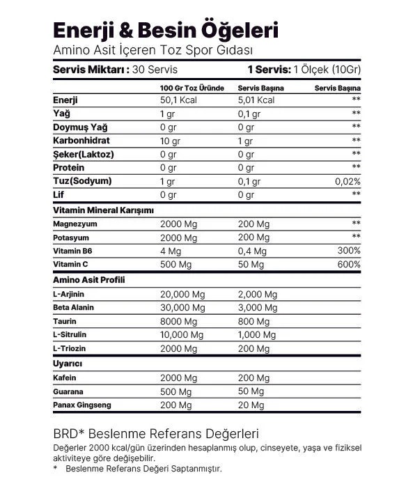 Think Doom’s Day toz formundadır. Her servisinde 7000 mg Amino Asit sunar. Her servisinde önemli elektrolitlerden 200 mg Magnezyum ve 200 mg Potasyum 50 mg C Vitamini ve 40 mcg B6 Vitamini içerir.