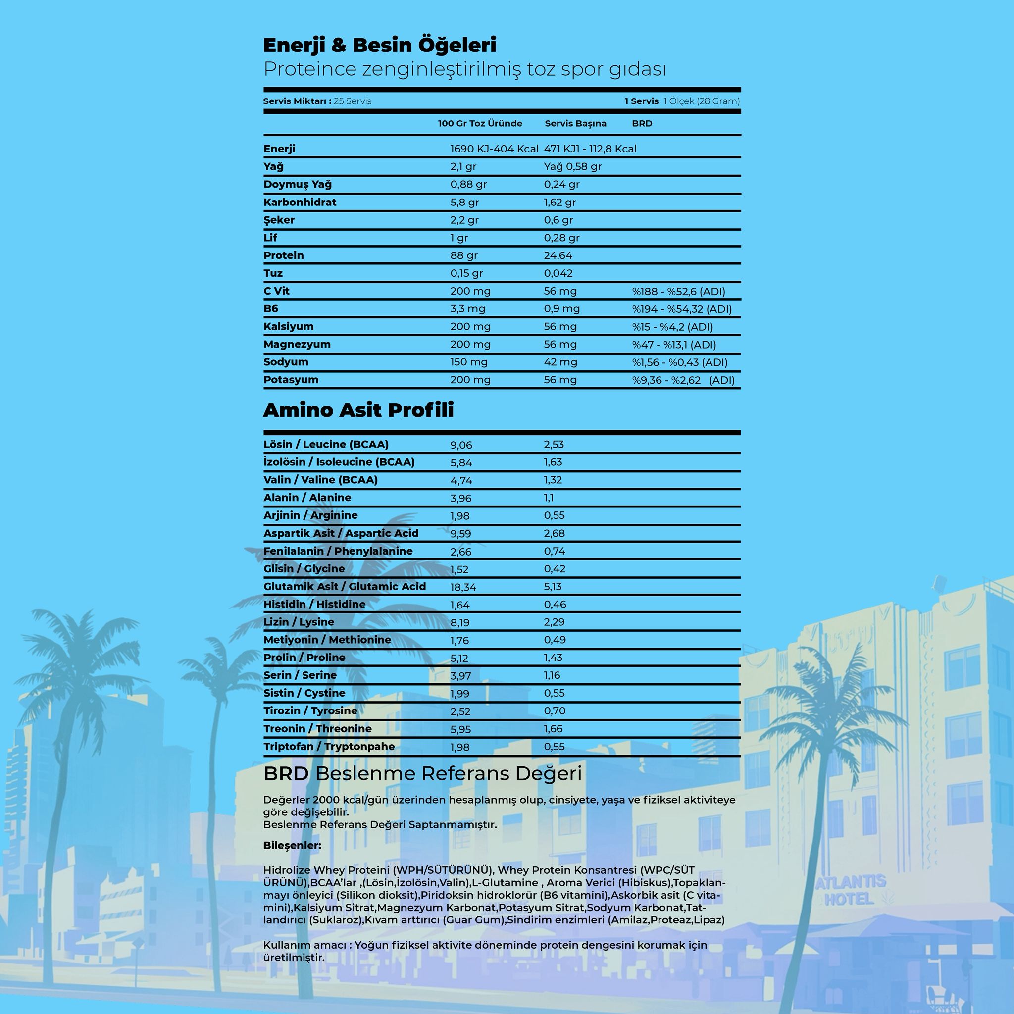 HER 28 GRAMLIK SERVİSTE 25 GRAM GERÇEK PROTEİN, AYRICA B6 VE C VİTAMİNİ İLE DESTEKLENMİŞ GÜÇLÜ BİR AMİNO ASİT PROFİLİ SUNAR.
